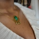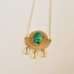 Le collier Tahira doré est associé a une belle pierre semi-précieuse en malachite et comporte 3 petits cauris. C’est un bijou lumineux et raffiné qui illuminera toutes vos tenues !